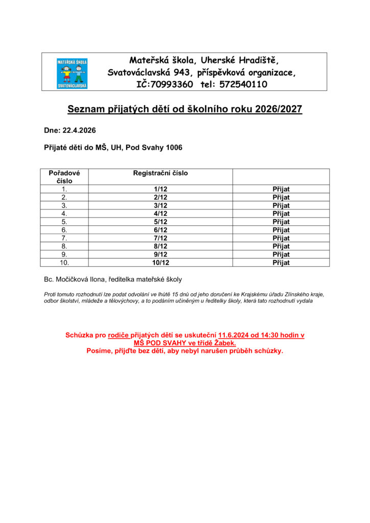 Vážení rodiče, seznam přijatých dětí pro školní rok 2024/2025 naleznete ke stažení ZDE